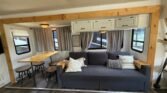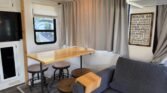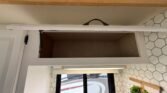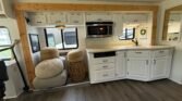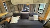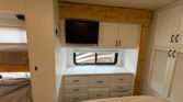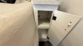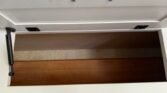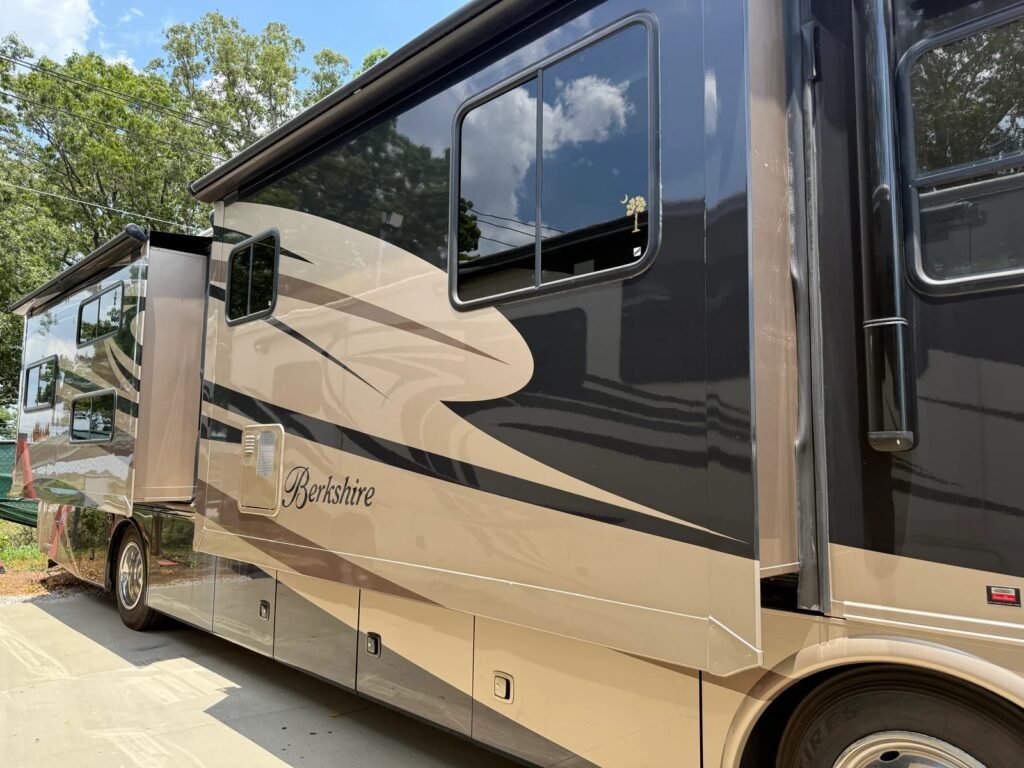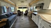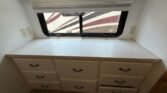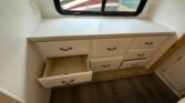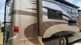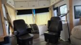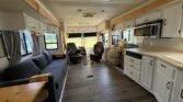 This bath and a half ‘03 Monaco Diplomat has 110k miles, brand new carpet, beautiful wood flooring and wood cabinetry throughout the coach. However, we did leave original tile in the master bathroom in the rear.. Pass thru storage compartments, some with slide-out trays. Could sleep around 4; Queen size bed, full mattress that comes out of driver side sofa. The small sofa has a drawer underneath, lots of storage!