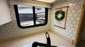 . About 34 – 35 feet long. Easy to drive and park compared to larger class A diesel RVs.