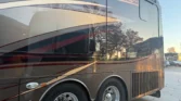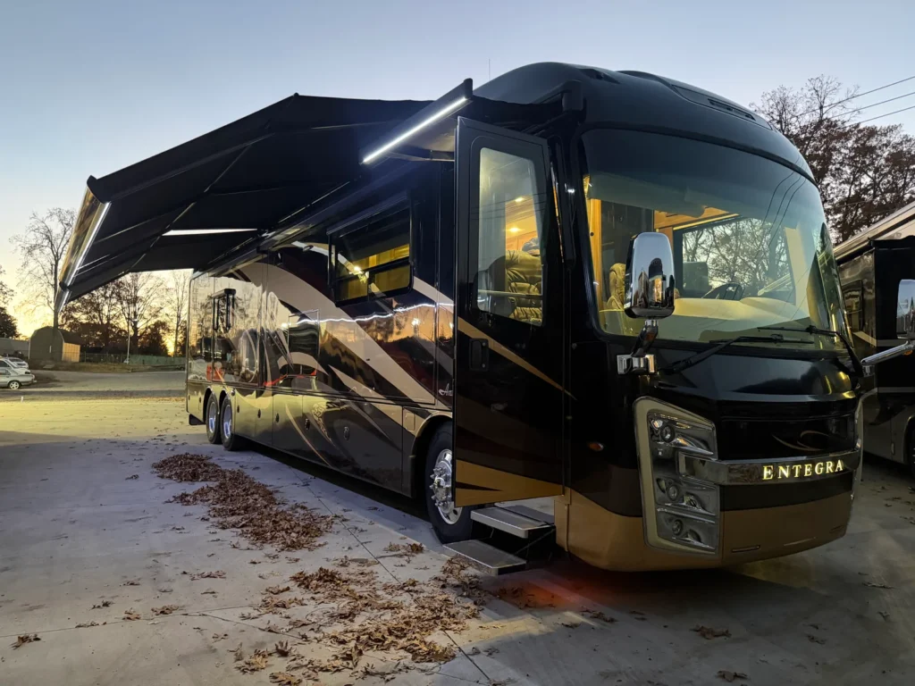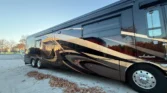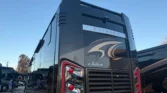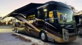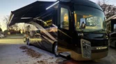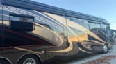 Allison 3000 MH 6speed automatic transmission. Towing capacity is 15000lbs. King size bed, washer & dryer stack, dish washer, true induction two burner stove. Across from the fire place & tv there’s an L shape sofa that folds in for travel. One piece fiber glass roof + gel coat exterior for durability and weather resistance. Electric powered slide outs. Large Girard awnings with night lights.